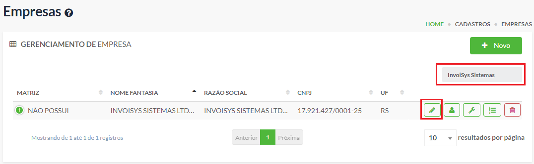 Após isso, utilizar o campo de pesquisa para encontrar a empresa que está utilizando na emissão do MDF-e, e então clicar no icone do lápis, para acessar os dados cadastrados da empresa